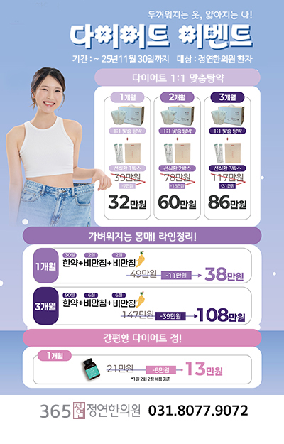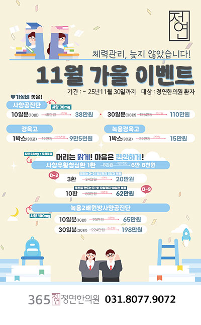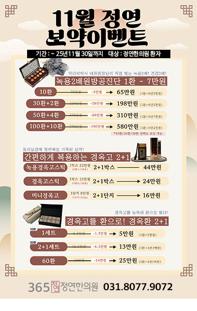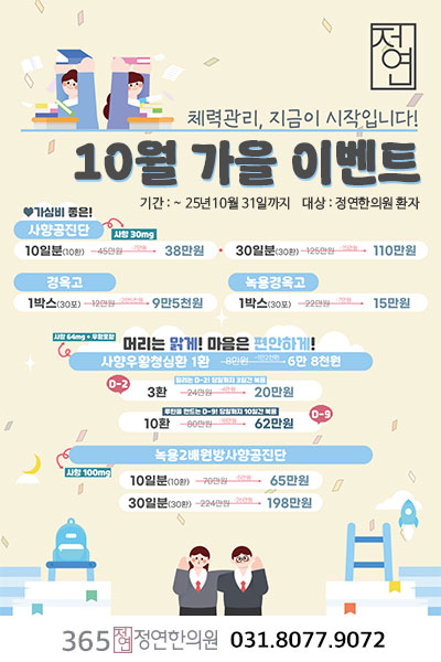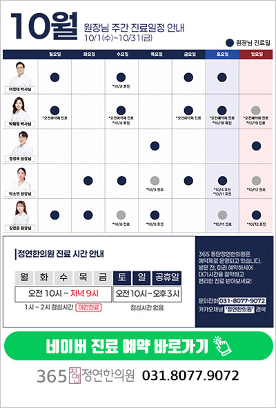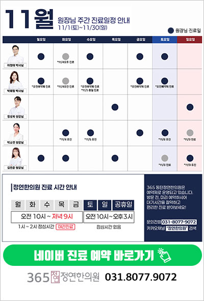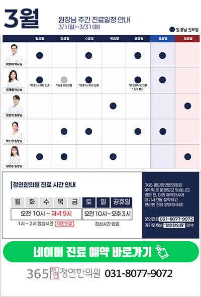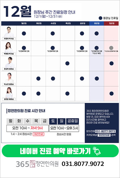 365정연한의원은 예약제를 시행하고 있습니다.방문 전 예약을 확인하시어 대기시간을 절약하고, 보다 편리한 진료를 받아보세요!